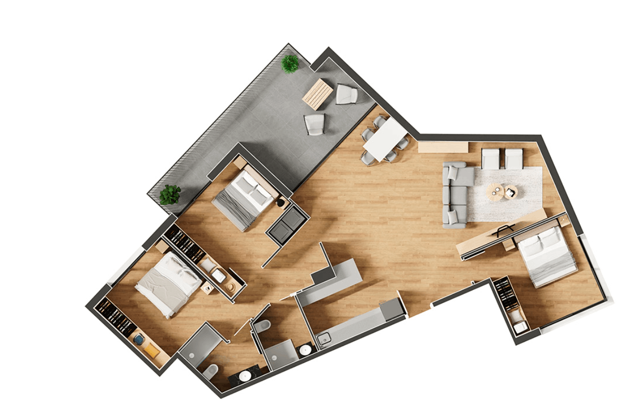La distribució es resol amb una zona de dia oberta i funcional que integra saló-menjador i cuina amb accés directe a la terrassa, aportant llum natural i continuïtat amb l’exterior. L´habitatge es troba al mateix nivell que la zona comunitària del solàrium, facilitant una connexió molt còmoda amb aquest espai.